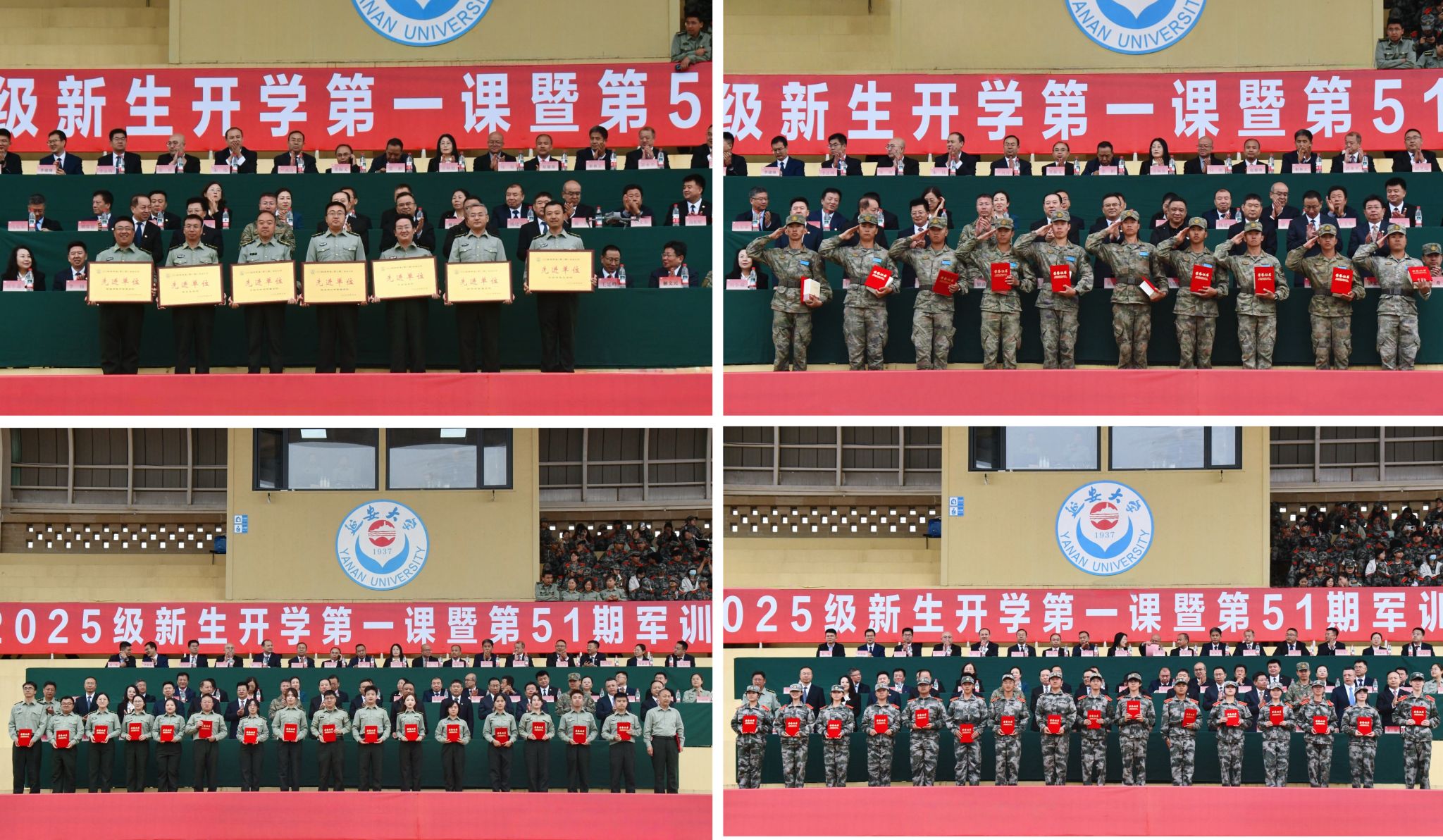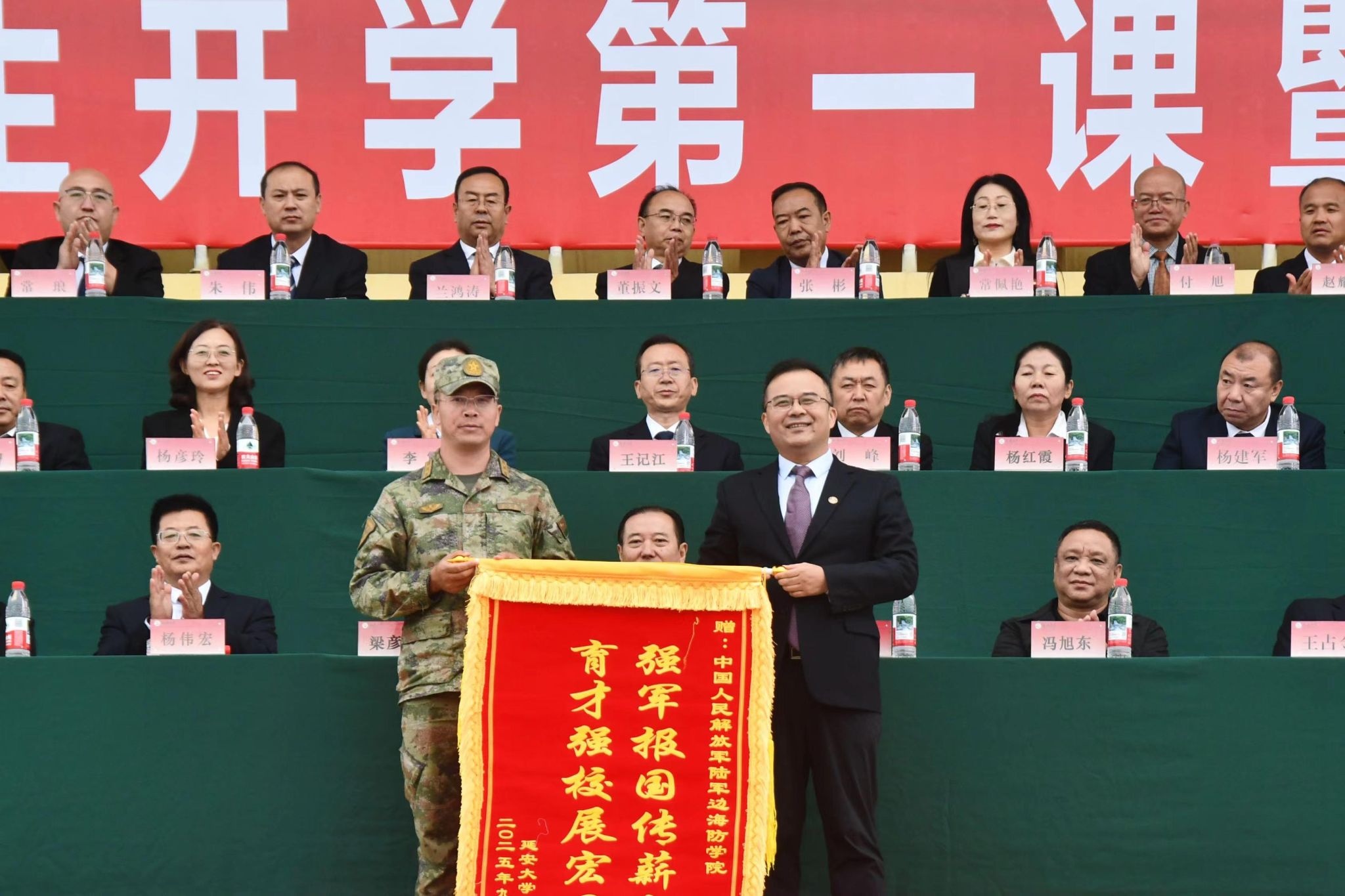 本网讯 9月19日上午,我校2025级新生开学第一课暨第51期军训汇报表彰大会在新城校区田径场举行。校党委书记高子伟、校长奚家米等全体在校校领导,中国人民解放军陆军边海防学院中校副大队长梁彦鹏,学员三大队学员七队少校队长汪舟,《人民周刊》杂志社总编辑冯旭东,各职能部门负责人,各学院党委书记、院长、副书记,全体承训教官、指导员,2025级全体本科生参加了本次大会。开学第一课由校党委副书记吕达主持,军训汇报表彰大会由学工部(武装部)部长张翔主持。