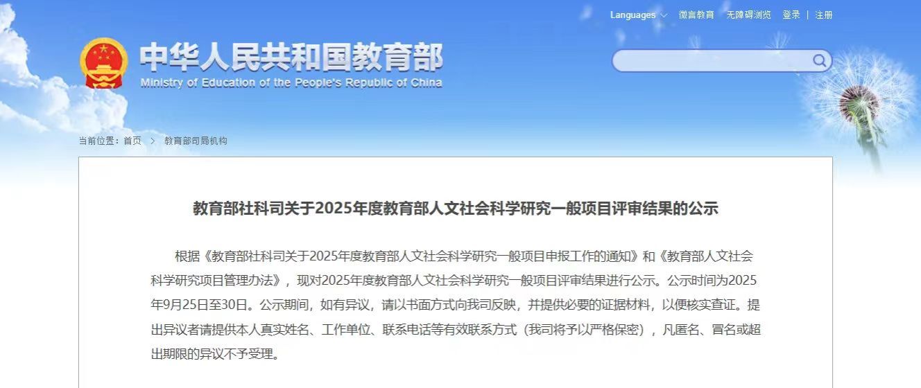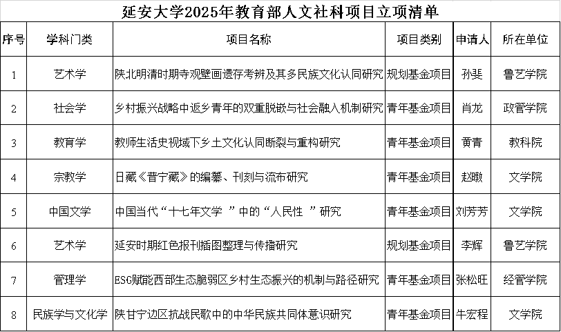 本网讯 9月25日,教育部社科司对2025年度教育部人文社会科学研究一般项目评审结果进行公示,我校共有8个项目成功拟获批立项。其中规划基金项目2项、青年基金项目6项,立项项目涵盖中国文学、艺术学、社会学、教育学、宗教学、管理学、民族学与文化学等研究领域。同比去年立项数增长5项(去年立项3项,历史同期最高立项6项),立项率增长167%,创历史新高,在陕西省省属高水平大学中排名第二,充分展现了学校在人文社会科学领域的研究实力和影响力。