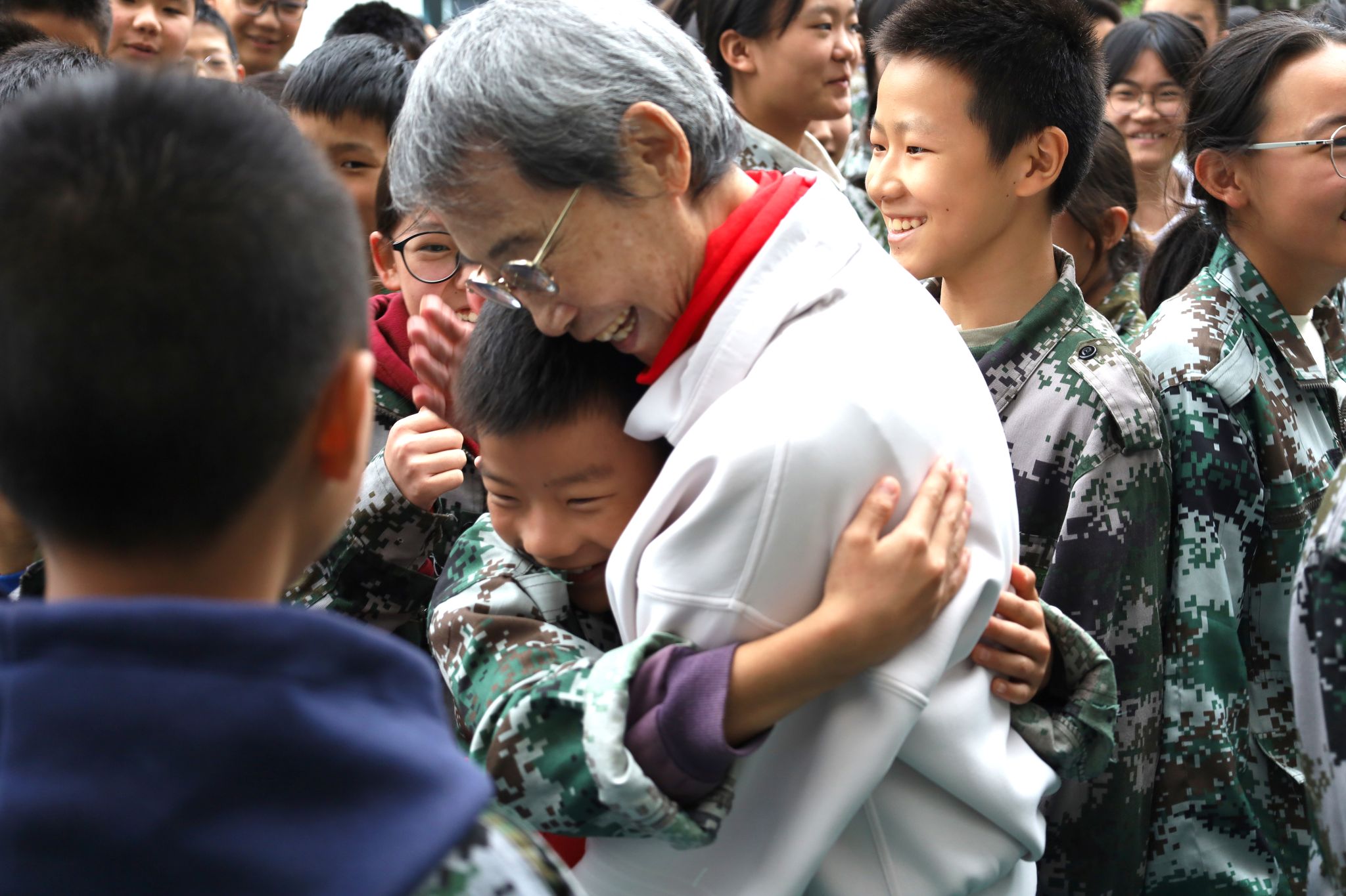聘任仪式结束后,同学们自发簇拥在两位教授周围,吴本立教授和杨志教授与同学们一个个热情拥抱,这发自内心的亲近与敬爱,让跨越岁月的红色火种,在温暖的怀抱中,悄然传递、蓬勃生长。