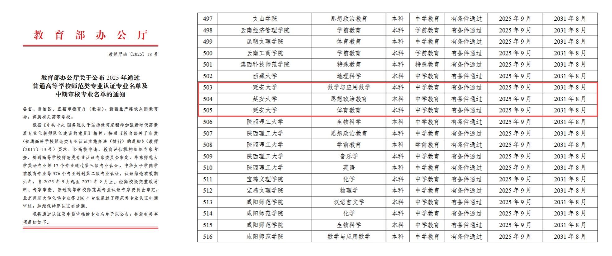 本网讯 近日,教育部办公厅发布《关于2025年通过普通高等学校师范类专业认证专业名单及中期审核专业名单的通知》(教师厅函〔2025〕18号),我校数学与应用数学、思想政治教育、体育教育三个专业通过师范类专业第二级认证。
