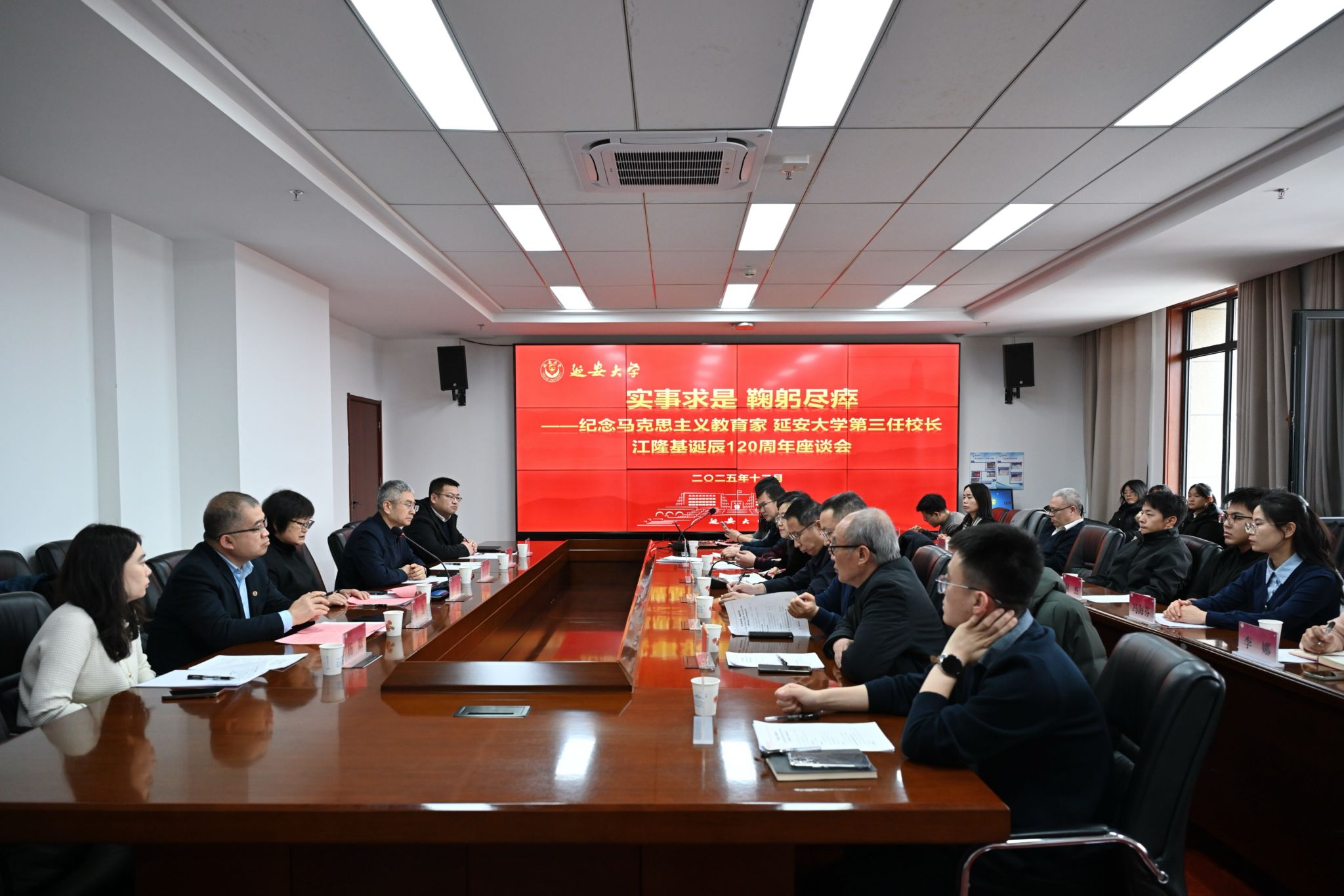 展览结束后,座谈会在行政楼六楼会议室召开,由王蕊蕊主持。江隆基之女江钊,以及特邀嘉宾北京大学档案馆、校史馆馆长余浚,中国人民大学校史馆副馆长杨默,隆基绿能集团党委书记李文学先后发言。各位嘉宾围绕追忆先辈事迹、阐释江隆基教育思想的当代价值、探讨实事求是精神在企业发展中的实践等维度进行了深入交流。