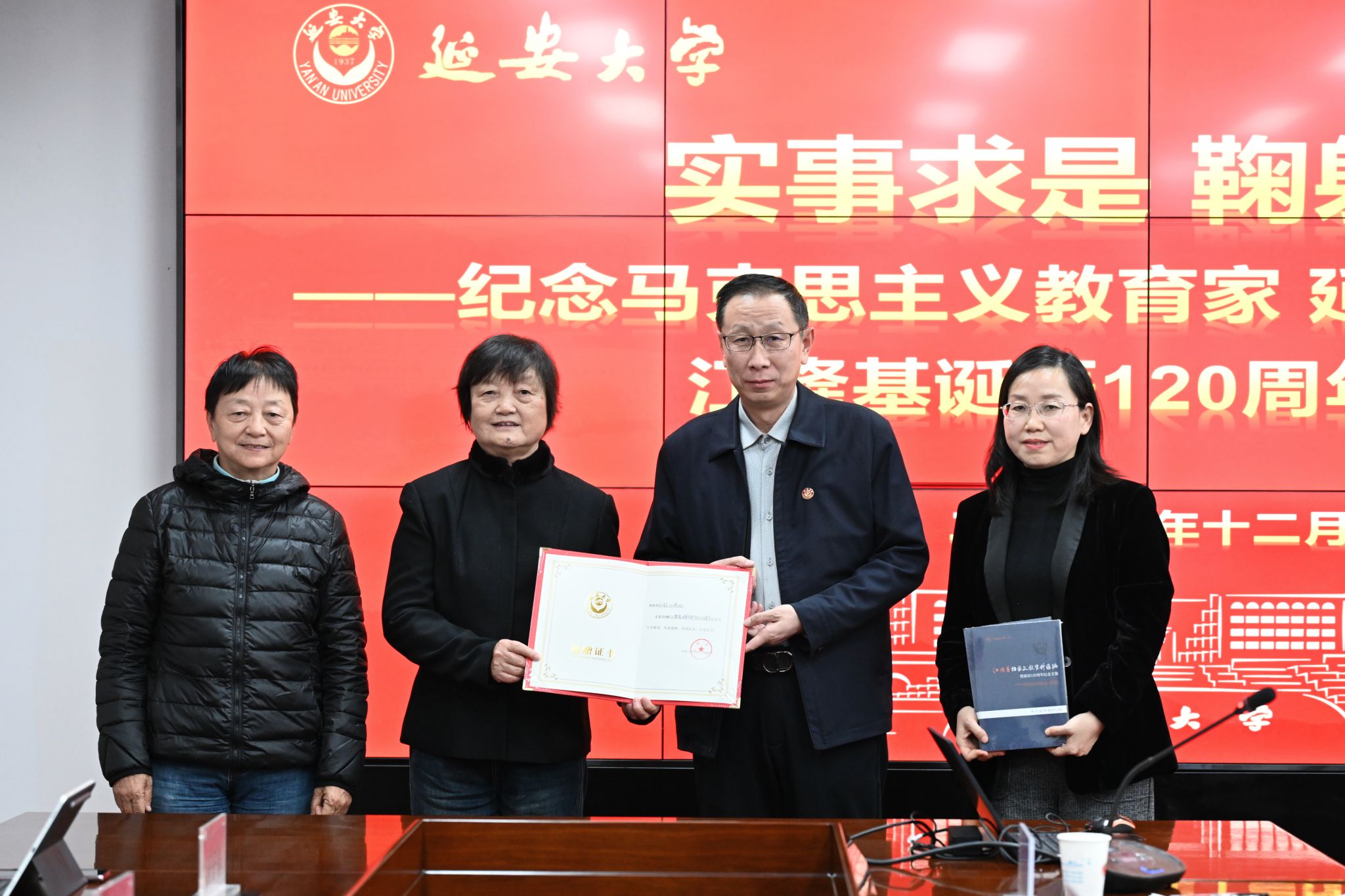 座谈会期间,江隆基之女江钊、江燕妮作为家属代表,向学校捐赠了江隆基珍贵档案资料与纪念文集。王延峰、王蕊蕊代表学校接受捐赠,并向捐赠人颁发证书。