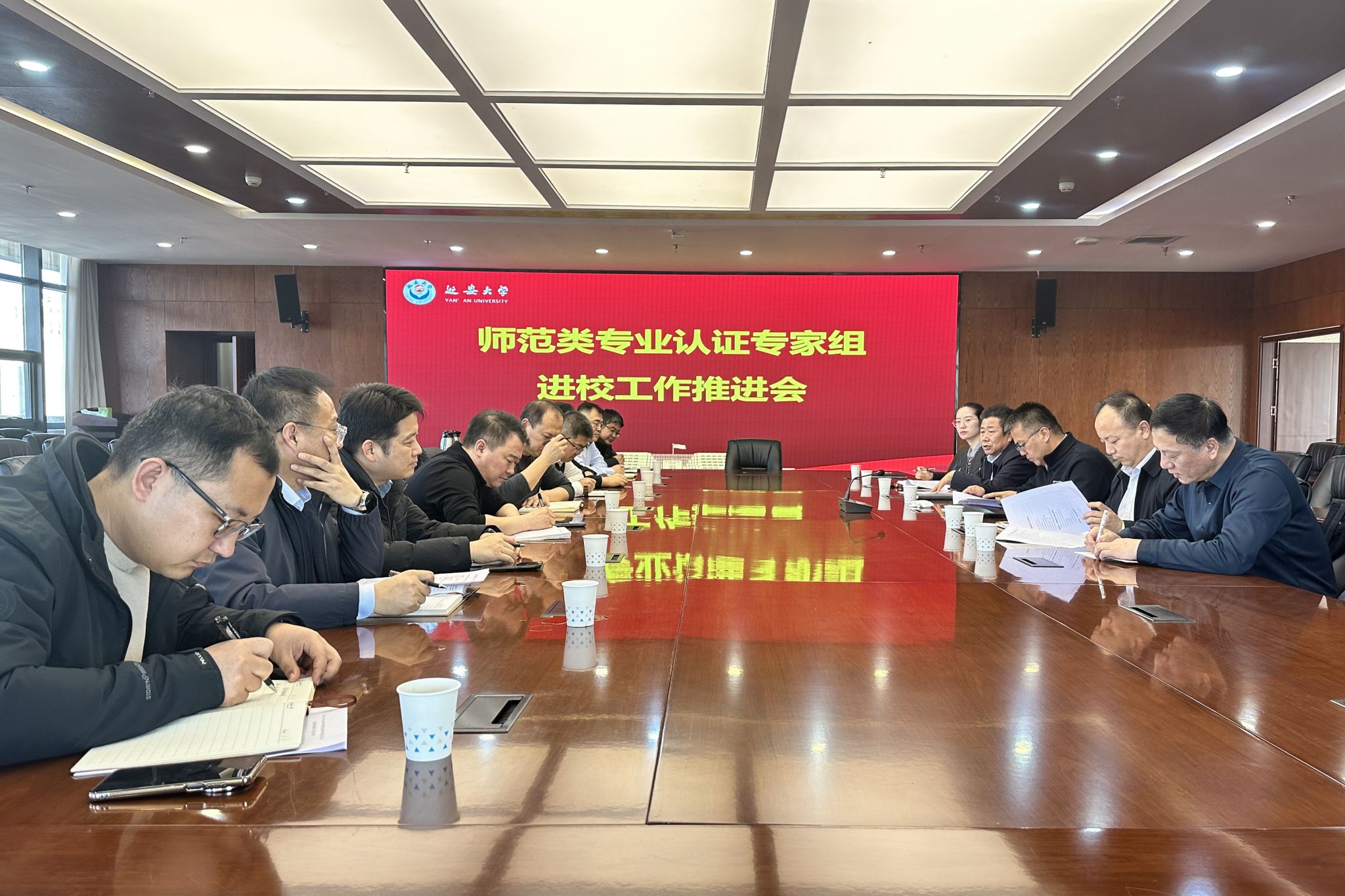 本网讯 12月8日下午,学校在行政楼二楼会议室召开师范类专业认证专家组联合进校考查工作推进会。副校长谭虎娃出席会议并讲话,五个师范专业的院长、书记和教学副院长,教务处、评估处相关工作人员参加了会议,会议由评估处处长王文东主持。