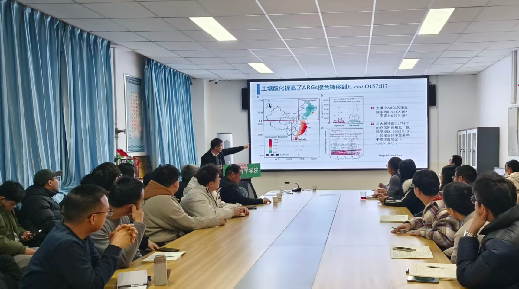 2025年12月22日上午,中国科学院亚热带农业生态研究所首席研究员吴金水、浙江大学特聘教授徐建明特邀为我校师生做题为“亚热带稻田土壤有机碳生物化学过程与固碳机制研究”和“酸化土壤的微生物功能退变及生态修复”的学术报告。报告在我校杨家岭校区特立楼二楼会议室举行,由生科院副院长李江文主持,共有50余名师生参加了本次报告会。