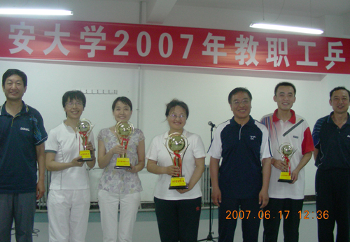 本次教职工乒乓球比赛,是我校近年来规模最大、参与人数最多的一场大型球类赛事。18个基层工会分会组织的33支代表队参加了比赛,参赛选手共140名。经过3天116场激烈角逐,男子团体冠亚军分别被政法学院和附属医院①队摘取,医学院和机关二分会获并列第三名;女子团体冠亚军分别被附院①、②队摘取,体育学院、医学院代表队获并列第三名;医学院苗乃周、机关一分会刘庆利和机关一分会刘建德、机关二分会白学清分别获得壮年组男子单打冠亚季军;政法学院马海波、附院张向东和教科院张社争、体育学院杨磊分别获得青年组男子单打冠亚季军;青年女子组单打冠亚季军分别是附院曹东梅、医学院蒲力群和附院李丽、贠秀丽。本届乒乓球比赛优秀运动员的获得者是政法学院马海波和附院曹东梅,优秀裁判员为体育学院的苏荣和周恒竹,最佳参与奖是外语学院的Theresa,优秀组织奖获得者为附院、医学院工会和机关一分会、教科院分会。