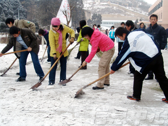 本网讯 2006年12月29日上午,雪花开始在校园内飘扬,由于温度较低、降雪时间较长,傍晚时分,路面积起厚厚一层雪,给行人带来不便。随后,“小红帽”服务队、政法学院、体育学院、化工学院同学计700余人在辅导员的带领下开始清理校园内主要通道积雪。其间,后勤处环卫工人也在一大门等地清扫积雪。后勤处处长台世强、学生处副处长高峰、政法学院党总支副书记葛彬,体育学院党总支副书记舒永安,化工学院党总支书记刘东平在现场指挥积雪清理、并于同学们一道投入到劳动中。