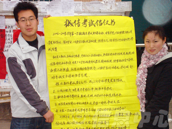 本网讯1月2日上午,体育学院体教05级3班班委组织全班同学在836教室进行“诚信考试承诺暨宣誓活动”,学生干部和学生代表分别进行了演说发言,倡议全班学生努力认真复习备考,以考试诚信光荣、考试作弊可耻为主导思想,坚持正气,用实际行动杜绝考试作弊。最后全班在班委的带领下进行了宣誓。