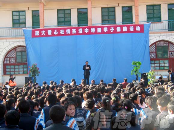 上午9点,爱心社社长程平组织社员将征集到的衣服、文具等若干物品送往沿河湾中学,并在沿河湾中学进行了现场捐助活动。沿河湾镇党委副书记高德飞,沿河湾中学副校长冯浩等发表讲话,对延大爱心社此行表示感谢,沿河湾中学39名特困生现场接受了捐助,副校长冯浩将写有“情结山区,爱心永存”的锦旗赠送给了爱心社,最后延大和沿河湾中学还进行了歌曲、腰鼓等精彩文艺节目,为活动助兴。
