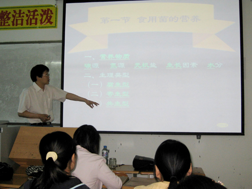 本网讯 陕西师范大学食品工程系教授张宝善日前先后两次来到我校,为2004级生物科学本科班学生讲授了《食用菌栽培学》。授课期间,张宝善与微生物教研室的老师交流了教学方法和教学收获,互通了研究方向,同时就本学科发展和目前研究的热点等问题进行了研讨。张教授认为,食用菌产业发展前景广阔,不仅改善了人类的食物结构,而且将对疾病的预防和治疗产生重大作用。张教授对任桂梅教授的羊肚菌研究和我校以红枣、苹果为代表的陕北经济果木研究十分看好。