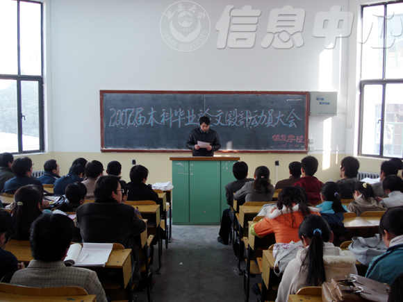 本网讯 12月23日下午,信息学院在第四阶梯教室召开了2007届本科毕业论文(设计)动员大会,院毕业论文(设计)工作领导小组全体成员和2007届毕业生参加了会议,大会由院毕业论文(设计)工作领导小组副组长张玉强副院长主持。
