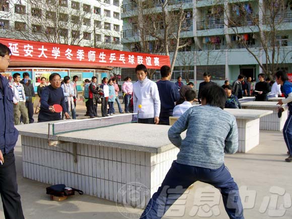 在3日下午举行的师生友谊赛中,应邀参赛的有校党委书记刘建德、校党副委书记、纪委书记刘庆利、学生处处长韩卿元等14位老师。持续两个小时的友谊赛进展顺利。一学生队员说:“和老师们在一起打比赛,我们没什么顾虑,老师们打得非常棒,我们发挥的也很充分。” 刘庆利同志感慨地说:“许多活动因为师生之间的年龄、身体素质及竞技水平有明显的差距而无法开展,选择乒乓球这一比赛形式有利于师生之间的交流和沟通。学生队伍及工作人员能够在寒冷的天气里坚守岗位,积极参加,这点很好,这种精神值得肯定和发扬。”