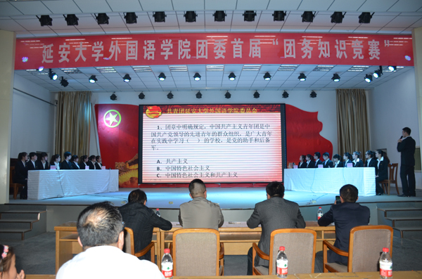 本网讯 5月12日晚,外语学院团委在学生活动中心举办了首届“四进四信助我成长”团务知识竞赛。学工部副部长王彦杰、外语学院党委副书记王随卷及学院400余名师生观看了比赛。校团委、历史文化学院、教科院 、体育学院团工作负责人担任评委。