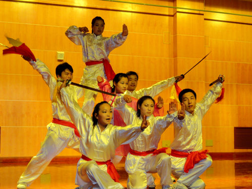 随后,2007、2008级优秀学生先后表演了安塞腰鼓、健美操、艺术体操、体育舞蹈、跆拳道、散打、武术等专业项目。