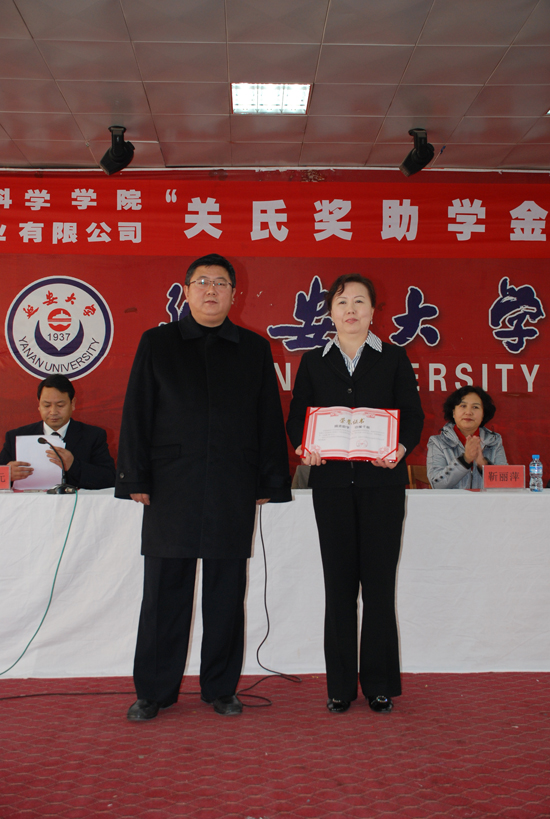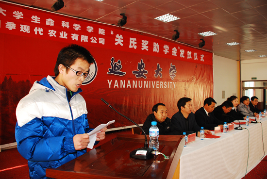 发放仪式上,生科院副院长孙志宏宣读了学校《关于颁发2009年度“关氏奖助学金”的决定》,董超妮等37位同学被评选为2009年度“关氏奖学金”获得者,朱艳等50位同学被评选为“关氏助学金”获得者。随后,高延龙副书记、王颖总经理、我校生科院党委书记靳丽萍、生科院副院长孙志宏、学助中心副主任雷志强和刘建铭先生分别向获得“关氏奖助学金”的学生颁发了奖学金及获奖证书。关氏奖学金获奖学生代表和关氏助学金受资助学生代表先后发了言。