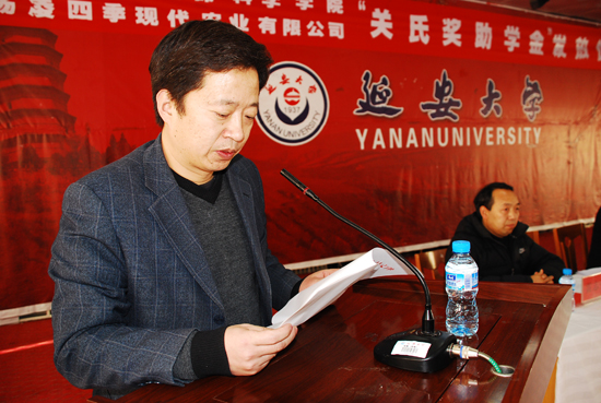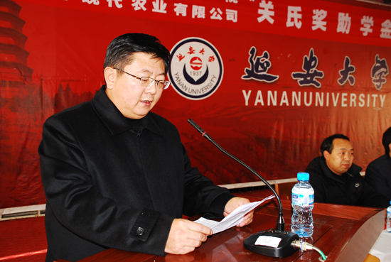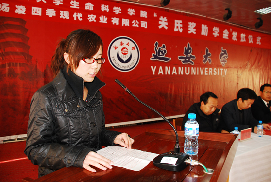 王颖总经理在讲话中指出,“关氏奖学金”的设立,是杨凌四季现代农业有限公司不断发展,寻求对中国教育事业奉献的第一次尝试。同时,力求通过“关氏助学金”的设立,带动更多社会有识之士,帮助大学生解决学习与生活中遇到的实际困难。