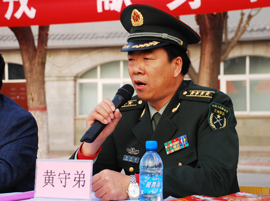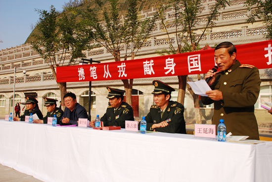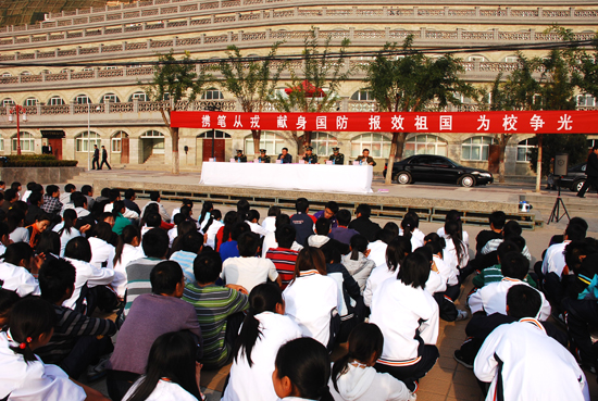 本网讯 今天下午,我校在窑洞广场举行在校大学生2009年冬季征兵宣传动员会议,延安军分区副司令员黄守弟大校、政治部主任陈乾强大校,宝塔区人民武装部部长陈占波中校、政委范卫东上校,延安军分区政治部白建国少校及我校党委副书记、藏宝阁精选资料大全998征兵工作领导小组组长高延龙出席了动员会。动员会由我校武装部部长王延海主持。