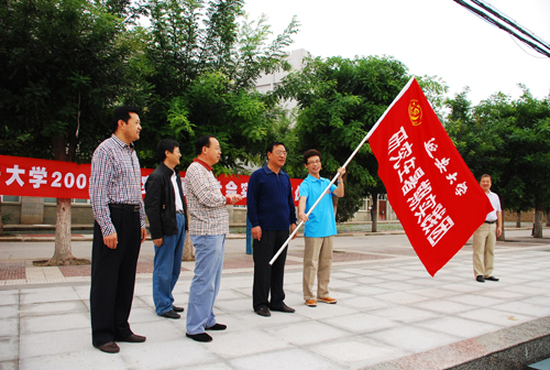 本网讯 8月24日上午,由我校研究生学院和政法学院组织的2009年研究生暑期社会实践活动出征仪式在窑洞广场举行,校党委书记刘建德,政法学院院长高尚斌、副院长张文生,研究生学院副院长杨曦东及研究生暑期社会实践团的全体成员参加了仪式。
