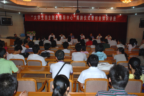 本网讯 6月25日上午,我校大学生自主创业指导中心揭牌仪式暨创业知识专题辅导报告会在校多功能厅举行。校党委副书记高延龙、延安市工商行政管理局局长刘一良、延安市人事局副局长宋晓文、延安市劳动社会保障局就业服务处主任李树勋、延安治平集团有限公司副总经理张明生等出席了会议。会议由我校就业指导中心主任马建平主持,