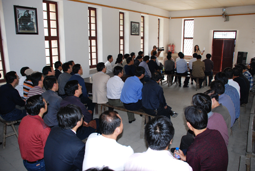在杨家岭革命旧址召开延安文艺座谈会的礼堂中,校内宣讲团专家、马列学院副教授冯建玫就延安文艺座谈会召开的历史背景、会议内容、精神实质和指导意义等内容作了讲解。在召开中国共产党第七次全国代表大会的礼堂中,冯建玫副教授就七大的历史贡献和七大理论成果的重大现实意义等问题进行了讲演。