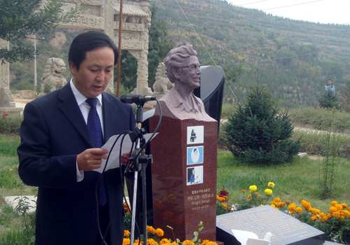 本网讯 日前,我校已故终身教授布里几德·克阿女士纪念碑揭碑仪式在延安仙鹤岭隆重举行。延安市政协副主席杜兴顺、市民政局副局长孙旺民、市精神文明办副主任呼延贵、民建延安市委秘书长任军,我校副校长胡俊生、国际处处长吴卫东,克阿女士亲属凯瑟琳·海德夫妇、延安仙鹤岭总经理宣永红以及外国语学院师生代表200余人参加了揭碑仪式。