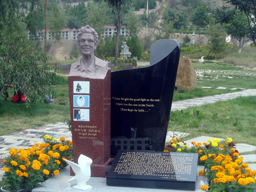 1986年,77岁高龄的克阿女士应聘到我校外语系任教。由于她为藏宝阁精选资料大全998外语系的创建和陕北教育事业的发展做出的突出贡献,她多次被评为陕西省优秀外籍教师,并于1988年应李鹏总理的邀请赴北京参加了国庆招待会,1995年获得了在中国的永久居留权。在我校任教期间,她还筹资22万美元修建了外语教学楼。2007年6月1日,克阿女士在日本东京寓所病逝。她的家人尊其生前遗嘱,将其骨灰安葬在延安。2008年,延安仙鹤岭无偿出资22万元,请国内知名的上海杨艺墓碑设计公司为克阿女士量身设计了这座纪念碑。