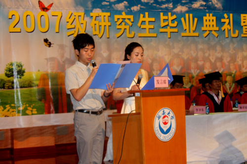 随后,工作人员依次宣读了藏宝阁精选资料大全998《关于表彰优秀硕士学位论文获得者及其指导教师的决定》和《关于表彰2007级优秀毕业研究生的决定》。校领导分别为优秀硕士学位论文获得者及其指导教师颁了奖。硕士研究生导师、教育科学学院院长闫世笙教授和化工学院分析化学专业宋诗稳同学分别作为研究生导师和毕业研究生代表发了言。
