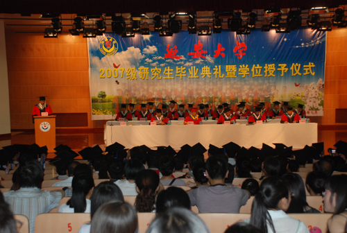 本网讯 7月5日上午,我校在5·23音乐厅举行2007级硕士研究生毕业典礼暨学位授予仪式,校党委书记、校学位评定委员会副主席、中共党史专业硕士研究生导师刘建德,党委副书记、校长、校学位评定委员会主席、生态学专业硕士研究生导师廉振民,副校长、马克思主义哲学专业硕士研究生导师马海平,副校长、校学位评定委员会副主席兼秘书长、行政管理专业硕士研究生导师胡俊生,副校长、体育教育运动训练学专业硕士研究生导师王延奇及校学位评定委员会全体委员在主席台就座,全体硕士研究生导师和2007、2008、2009级硕士研究生参加了仪式。仪式由校学位评定委员会副主席、副校长许静洪教授主持。