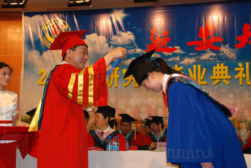 毕业典礼上,工作人员首先宣读了校学位评定委员会《关于授予贾君亮等135位研究生硕士学位的决定》,廉校长为研究生们一一授予了学位。