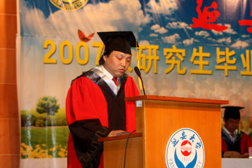 廉振民校长在讲话中希望获得硕士学位的研究生们在即将离开母校、走向新的工作岗位之际,能树立远大的志向,从小事、从基层做起,学会做人、学会做事,把握正确的人生方向,坚守优秀的职业道德,体现延大学子的杰出风范。
