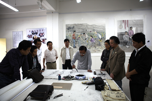 本网讯 今天上午,校党委书记刘建德在党办主任田伏虎、鲁艺学院院长刘常喜、副院长冯颜明等的陪同下,来到学生活动中心,观看了鲁艺学院美术系艺术设计专业毕业作品展览。随后,刘建德书记一行又前往怡苑教学区三楼展厅,观看了美术学专业的国画、油画作品展览。刘书记一边饶有兴趣地观看学生的展览作品,一边和在场的师生进行交谈。参观完画展,刘书记欣然命笔,为毕业画展题词,勉励鲁艺学院广大师生刻苦钻研,多出精品。
