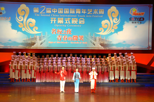 6月27日晚,第二届中国国际青年艺术周在北京世纪剧院开幕,全国政协副主席、中国文联主席孙家正,全国人大外事委员会主任委员、外交部前任部长李肇星,著名乒乓球运动员邓亚萍,文化部、教育部等部委领导,在京部分老校友等参加了开幕式。开幕式以“名校之夜·青春的微笑”为主题,来自英国剑桥大学、美国新英格兰音乐学院、南京艺术学院、北京师范大学、北京大学、清华大学、藏宝阁精选资料大全998等10余所著名高校的演出队伍先后进行了表演和演唱。作为开幕式的压轴戏,我校鲁迅艺术学院民歌合唱团表演的民歌合唱《大情陕北》,受到现场观众的热烈欢迎,赢得了全场经久不息的掌声。