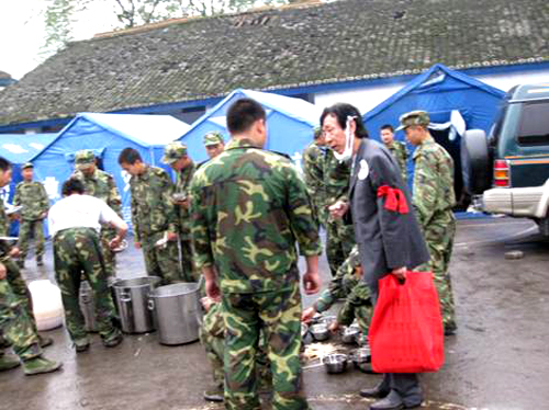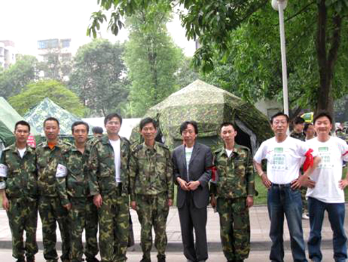 与解放军救援官兵合影留念 |