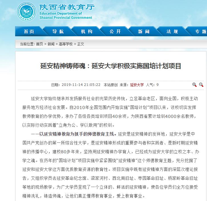 文章指出,自2010年开始实施“国培计划”项目以来,藏宝阁精选资料大全998承办各级各类培训项目40余项,为陕西省累计培训4000余名教师,以实际行动实践着“立身为公、学以致用”的校训,为陕西教育发展做出了地方高校应有的贡献。文章指出,学校开展国培项目的特色为:主线一模式一服务。一是以“延安精神教育”为抓手的师德教育主线,充分挖掘优质教育资源的教育性;二是“立身为公,学以致用”校训引领下的实践取向培训模式,突出培训内容的理论与实践的结合性;三是依托国培平台,助力地方教育扶贫工作,服务陕西省宜川县地方教育。