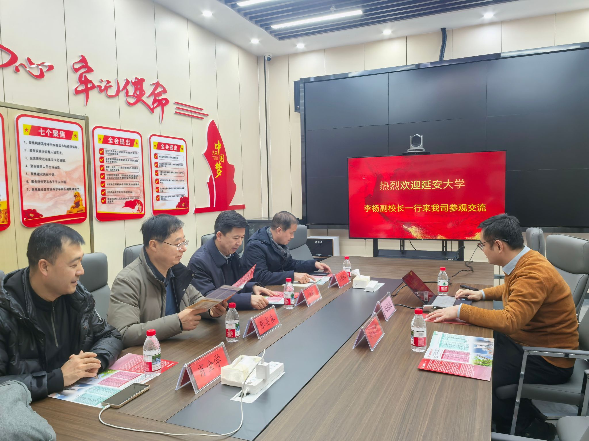 李杨一行来到知名校友企业——陕西安得科技实业有限公司,张毅敏董事长在办公楼下热情迎接,陪同大家参观了研发实验室、生产车间等。座谈会上,大家观看了企业宣传片,李杨介绍了学校“十四五”办学成就和“十五五”规划有关情况以及来访目的;张富春介绍了物电学院办学发展情况和存在的困难;张毅敏董事长对母校来访的领导老师表示热烈欢迎,他回顾了在延大求学的难忘经历,个人职业生涯和艰苦创业发展历程,介绍了公司业务范围和发展愿景;双方还就进一步深化战略合作、促进科技成果转化和大学生就业、助力学校高质量发展等方面进行了交流。