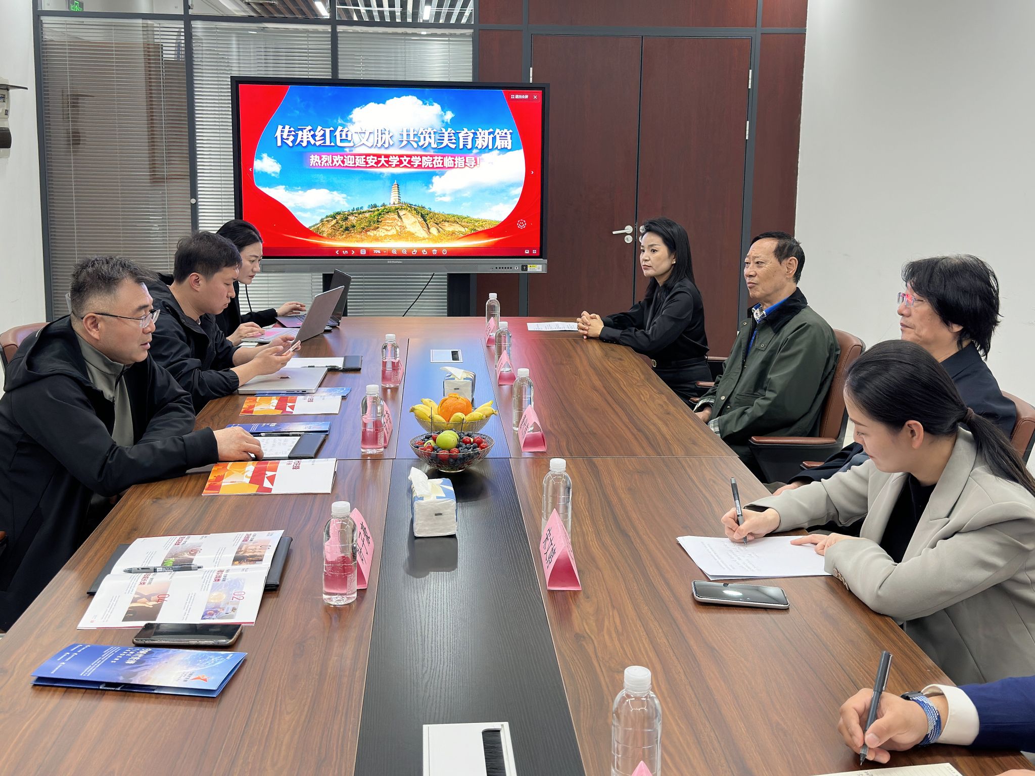在陕西艺联美育文化传播有限公司,集团副总唐代伟、黄颖全面介绍了公司业务板块与发展规划,总经理宋文婷重点介绍了旗下红色研学品牌“今时代先锋”的运营模式及实践育人成果。党子奇介绍了学院在革命文艺研究、红色文化传承创新等领域的学术优势。双方成功签订合作协议,为后续实质性合作奠定坚实基础。会后,党子奇一行还实地考察了长安书院。长安书院常态化开展青少年研学实践活动,古旧书店馆长冯昊宇、晶亭文化传媒总经理王阿婷分别介绍了明清古籍保护、古法造纸及活字印刷等传统文化体验项目。双方就传统文化传承与学生实践能力培养等议题交换了意见。