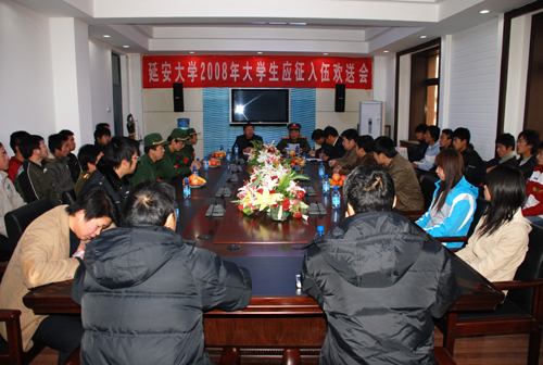 记者:郭 伟 发布日期:2008年12月10日 本网讯 12月9日上午,我校在逸夫楼第三会议室举行2008年大学生入伍欢送会,党委副书记高延龙及教务处、学生处、武装部、人文学院和体育学院的主要负责同志和4位应征入伍大学生的班主任和同学代表参加了欢送会。