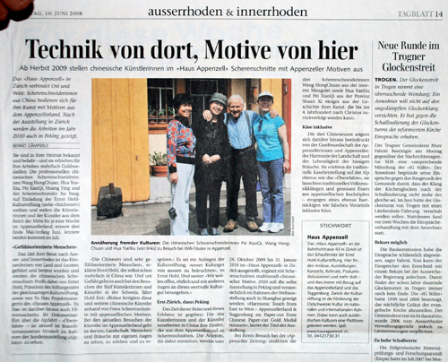 记者:郭 伟 发布日期:2009年1月4日 本网讯 日前,我校民间美术研究所副教授裴晓旗与内蒙古科技大学包头师范学院美术学院副教授王红川及陕西靖边县民间剪纸艺术家华月秀应瑞士阿彭策尔文化基金会会长恩斯特·霍尔先生的邀请,赴瑞士进行了文化艺术考察,并与瑞士的剪纸艺术家进行了座谈和交流。