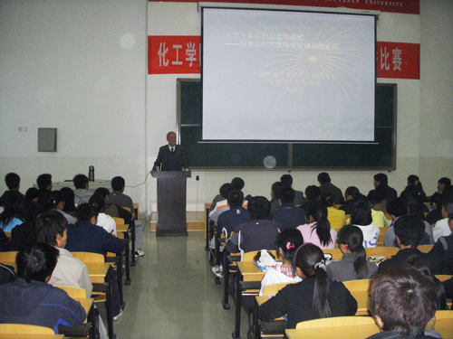 作者:郑 兵 核稿:舒永安 发布日期:2009年4月15日 本网讯 4月8日下午,原北京体育学院副院长、国家教委体卫艺司副司长,全国普通高校体育教学指导委员会主任,全国著名学校体育学专家曲宗湖教授应邀访问我校,并在玉章楼5301阶梯教室为我校300多名师生作了题为《大悲大喜后的反思与遐想——后奥运时代我国学校体育的走向》的学术报告。
