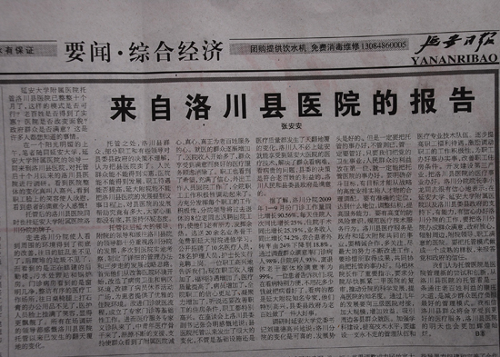 记者:袁广斌 兰天峨 编辑:校报编辑部 发布日期:2009年11月16日 本网讯 11月12日,《延安日报》在要闻版发表了我校附属医院宣传科科长张安安同志采写的通讯《来自洛川县医院的报告》。