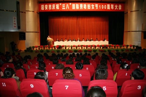 记者:兰天峨 编发:新闻中心 发布日期:2010年3月8日 本网讯 3月5日,延安市庆祝“三八”国际劳动妇女节100周年大会在延安文化艺术中心礼堂隆重举行,来自全市各界的妇女代表参加了大会。