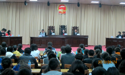 作者:宋 超 核稿:李 伟 编发:新闻中心 发布日期:2010年4月26日 本网讯4月24日晚,学生法学社第四届模拟法庭活动在学生活动中心举行,校党委书记刘建德,政法学院院长高尚斌、副院长邹腊敏,校团委副书记李伟,宝塔区司法局副局长马小权,以及学生处、综治办、政法学院部分师生旁听了模拟法庭。