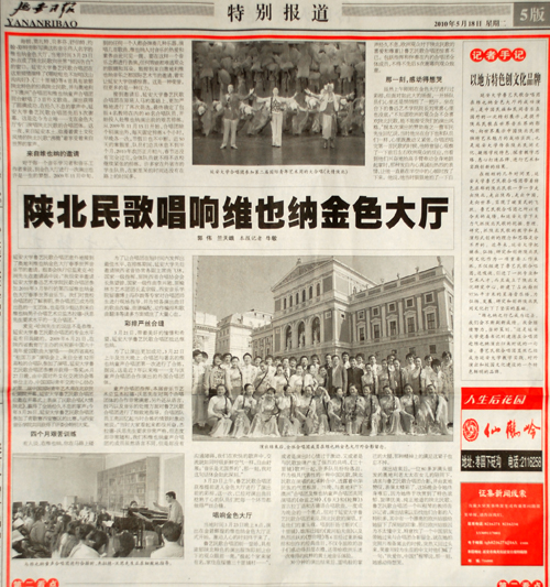 记者:袁广斌 发布日期:2010年5月18日 本网讯 在今天出版的《延安日报》第五版的特别报道中,以三分之二的篇幅发表了由我校新闻中心记者郭伟和兰天峨撰写的纪实通讯《陕北民歌唱响维也纳金色大厅》。