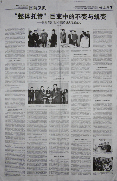记者:袁广斌 兰天峨 发布日期:2010年9月1日 本网讯 8月27日,我国卫生行业的权威报纸《健康报》,在第7版以整版的篇幅,发表了李建雄同志采写的长篇工作通讯《“整体托管”:巨变中的不变与蜕变——陕西省洛川县医院跨越式发展纪实》,并配发了5张图片。