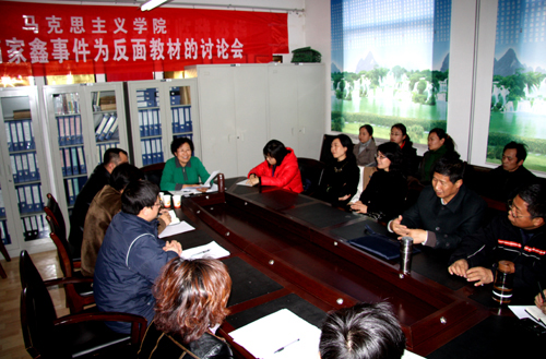 记者:兰天峨 发布日期:2010年12月11日 本网讯12月10日下午,我校马克思主义学院关于以“药家鑫事件”为反面教材的教师座谈会在学院会议室举行,学院全体思想政治理论课教师参加了座谈。